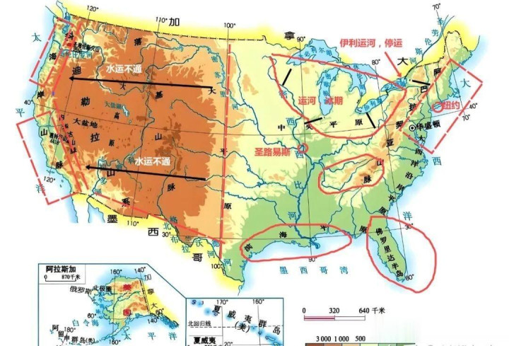 好意思国的河流看着多,其实有个致命的短板:流向太乱了。东西海岸的河流各往东西流,最大的密西西比河,却是从北往南流,和其他河流根蒂连不到一王人。
