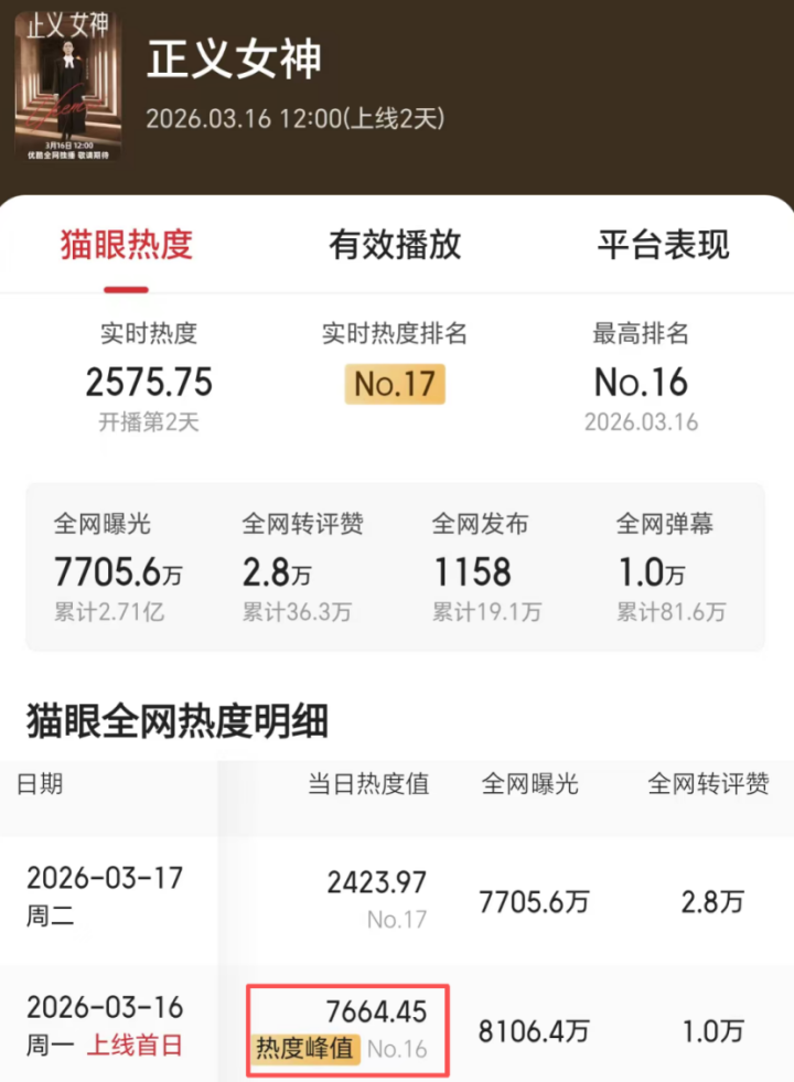终于,“新闻女王”佘诗曼再次开端,这次她带来了夙昔港剧的另一大“牌号”的律政剧《正义女神》,该剧于裤播出,仅一晚热度破7600。