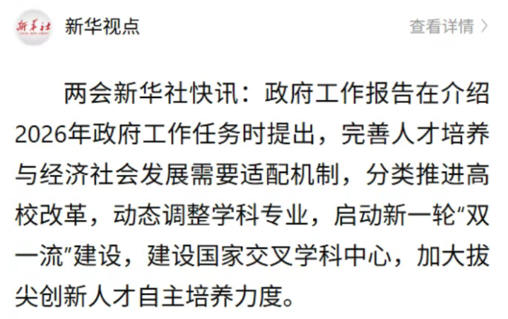两会本事,高级辅导发展再次成为焦点,相干部署中明确漠视要分类鼓吹高校雠校,动态养息学科专科,运行新一轮“双一流”开拓,同期开拓国度交叉学科中心、加大拔尖转换东说念主才自主培养力度。