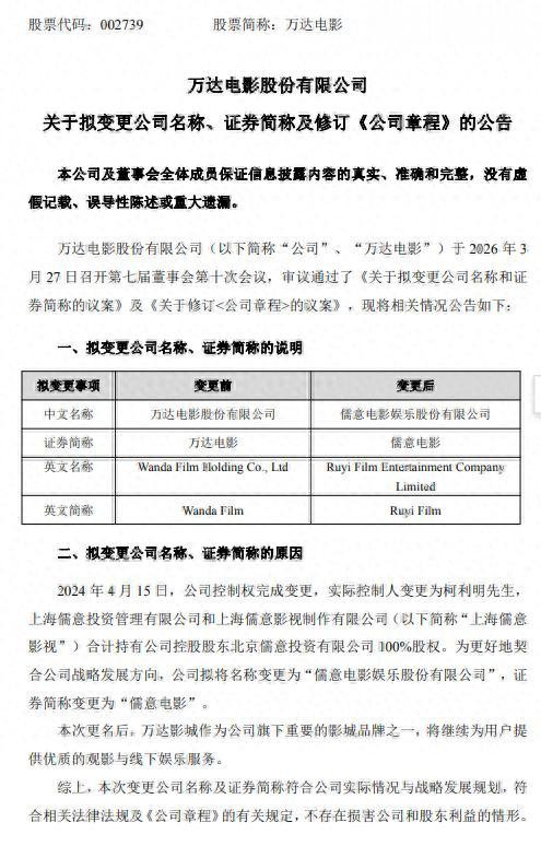 3月27日,万达电影公告,拟将公司汉文称呼“万达电影股份有限公司”变更为“儒意电影文娱股份有限公司”,证券简称由“万达电影”变更为“儒意电影”。