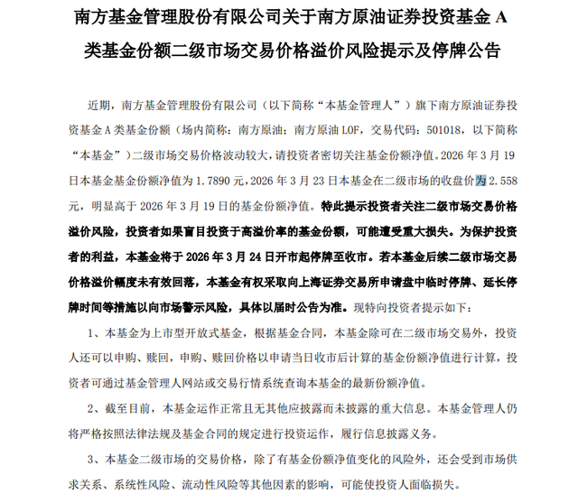 南边原油LOF、嘉实原油LOF、原油LOF易方达等多只居品成为当日最吸睛的景观线。但是,涨停的喧嚣尚未散去,风险警示密集莅临。当晚,多家公募机构纷纷发布公告,晓谕旗下石油基金将于3月24日停牌,警示二级市集来回价钱溢价风险。