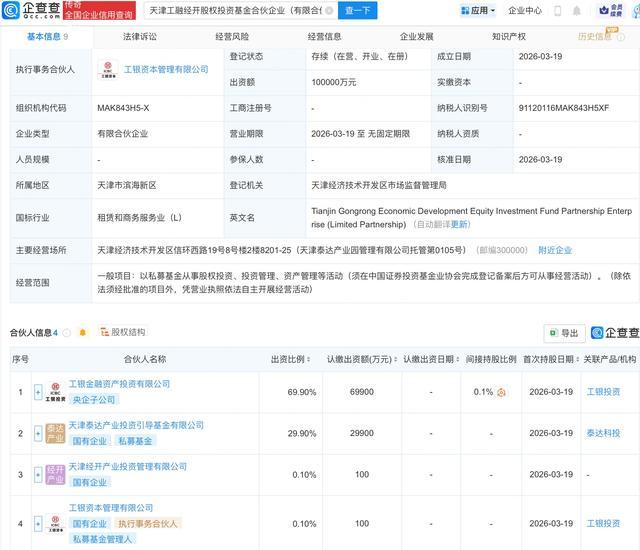 企查查APP显现,近日,天津工融经开股权投资基金合股企业(有限合股)熏陶,B体育官方网站首页出资额10亿东说念主民币,狡计限制为以私募基金从事股权投资、投资解决、钞票解决等举止。企查查股权穿透显现,该企业由工银金融钞票投资有限公司、工银成本解决有限公司等共同出资。