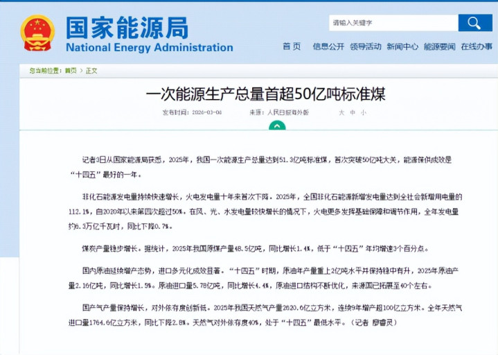 国度动力局:《一次动力坐褥总量首超50亿吨轨范煤》2026-03-06