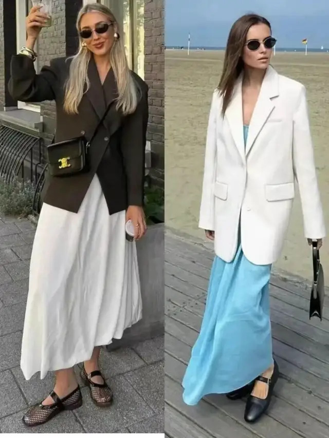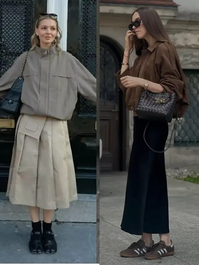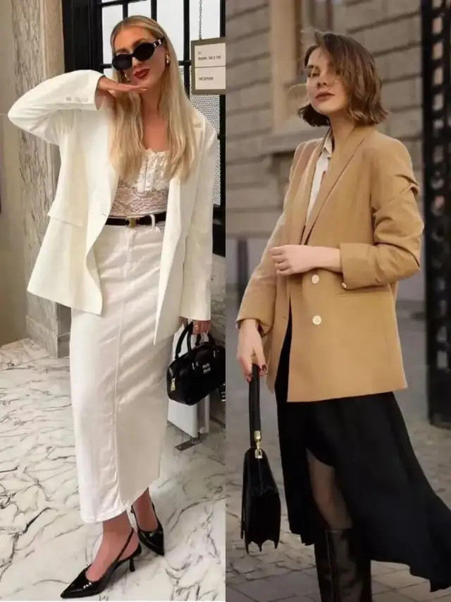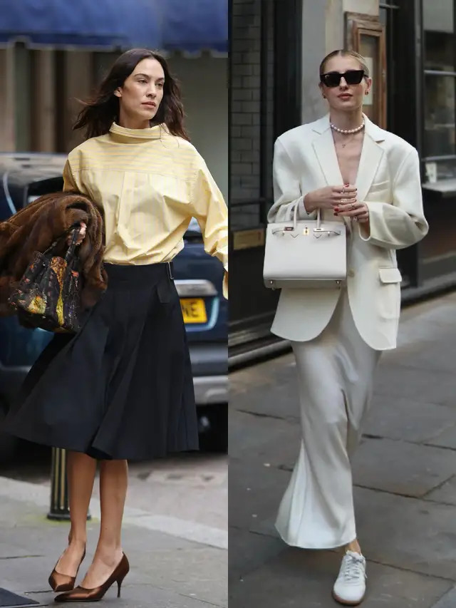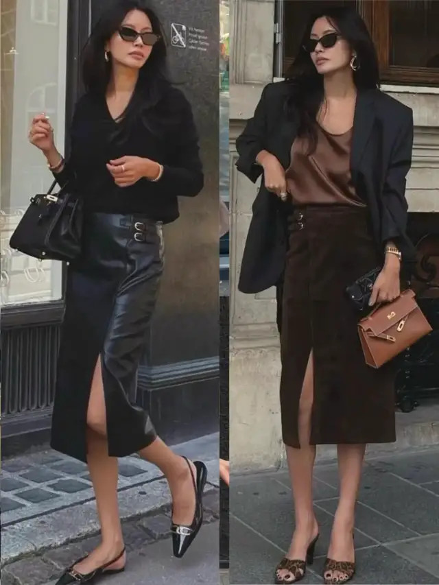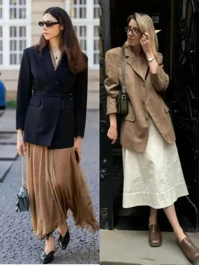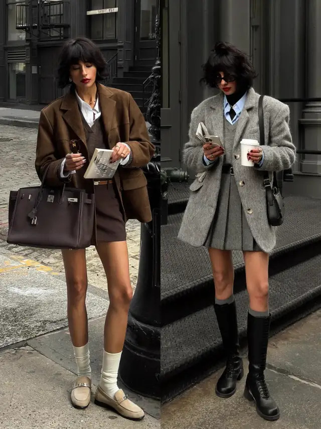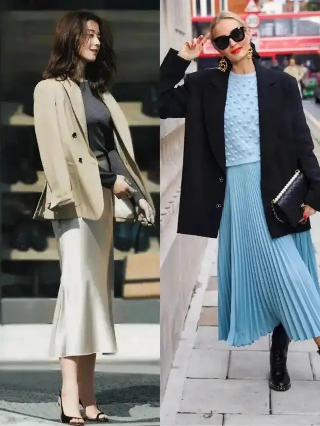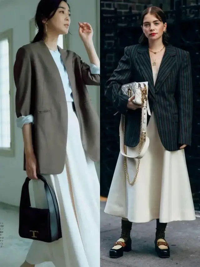 像上头这两套穿搭,汲取了挺括有型的西装外衣,搭配上直筒短裙、压褶短裙,利落又有气场,自便穿出修长体格比例,以高档感元气满满。
