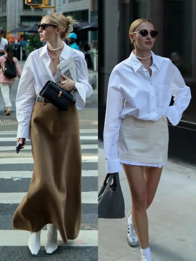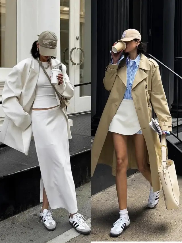 当我们换成一件卡其色的风衣外衣,内搭条纹衬衫,叠穿白 T 恤,配上一条白色的短裙。这种“下衣失散穿法”能更好地展现大长腿的上风,脚踩一对德训鞋,走起路来循序生风。在春天里,就能使得穿搭者自带气场。