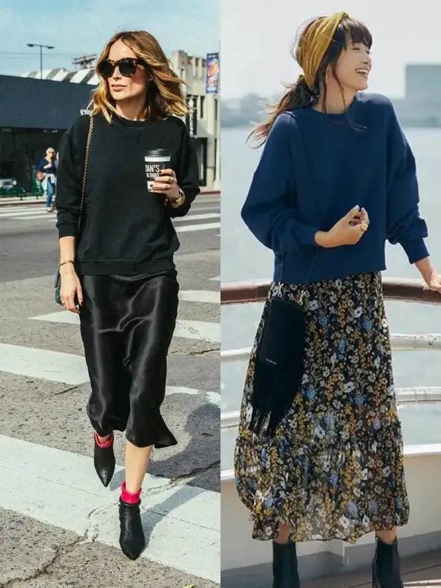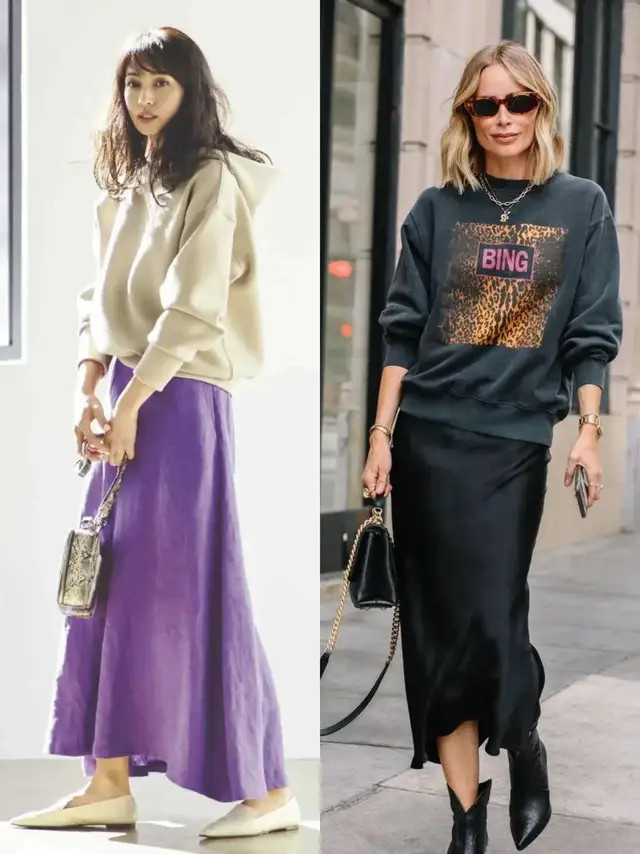 穿裙子不必遴荐过于零散的式样,纯色系裙装更好搭配。举例上头紫色半裙玄色半裙,配上一件卫衣,既失业又优雅。