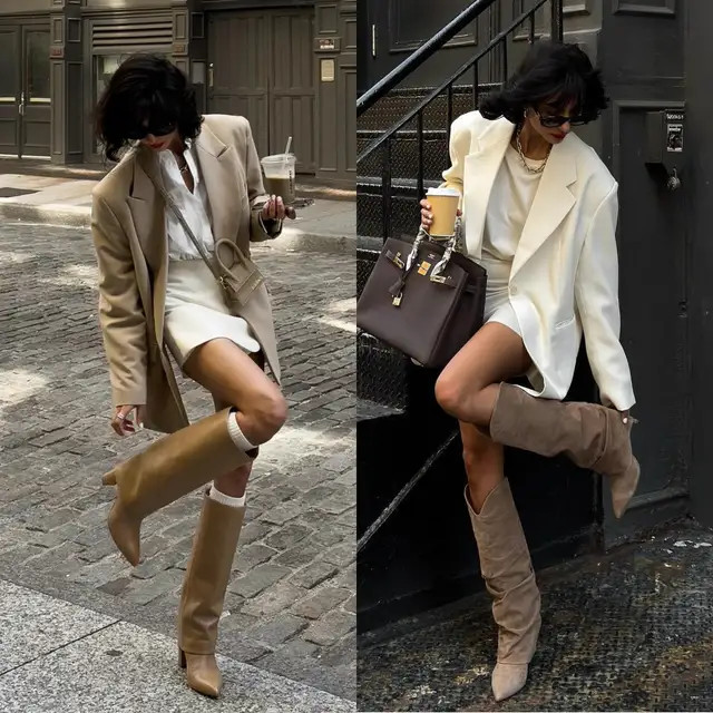 体格高挑纤瘦的女生,选一件卡其色西装外衣内搭白色衬衫,以白色短裙,脚踩一对好意思拉德色系的中筒靴,这种低迷漫度和亮色组合搭配酿成撞色,端倪感分明。