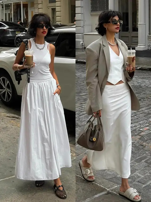 换成一件深咖色的西装外衣,搭配上一条白色的伞裙,脚踩一对镂空单鞋,利落又显比例。