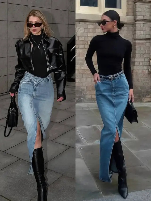 偏疼酷感与起义,玄色短款皮衣外衣搭配一件玄色打底衫,下装遴荐天生就领有先锋元素的牛仔直筒开叉半裙。脚上踩的玄色中筒靴,就不错酿成裙中靴穿搭,裙子间的靴子乍明乍灭,利落展露长腿,走起路来又飒又好意思。