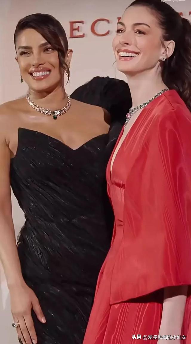 在拍摄进程中,她看见安妮海瑟薇站得太靠边,主动伸手去搂她的腰,把她往中间拉过来,而且我方往后站了点,让了半个身位出来。